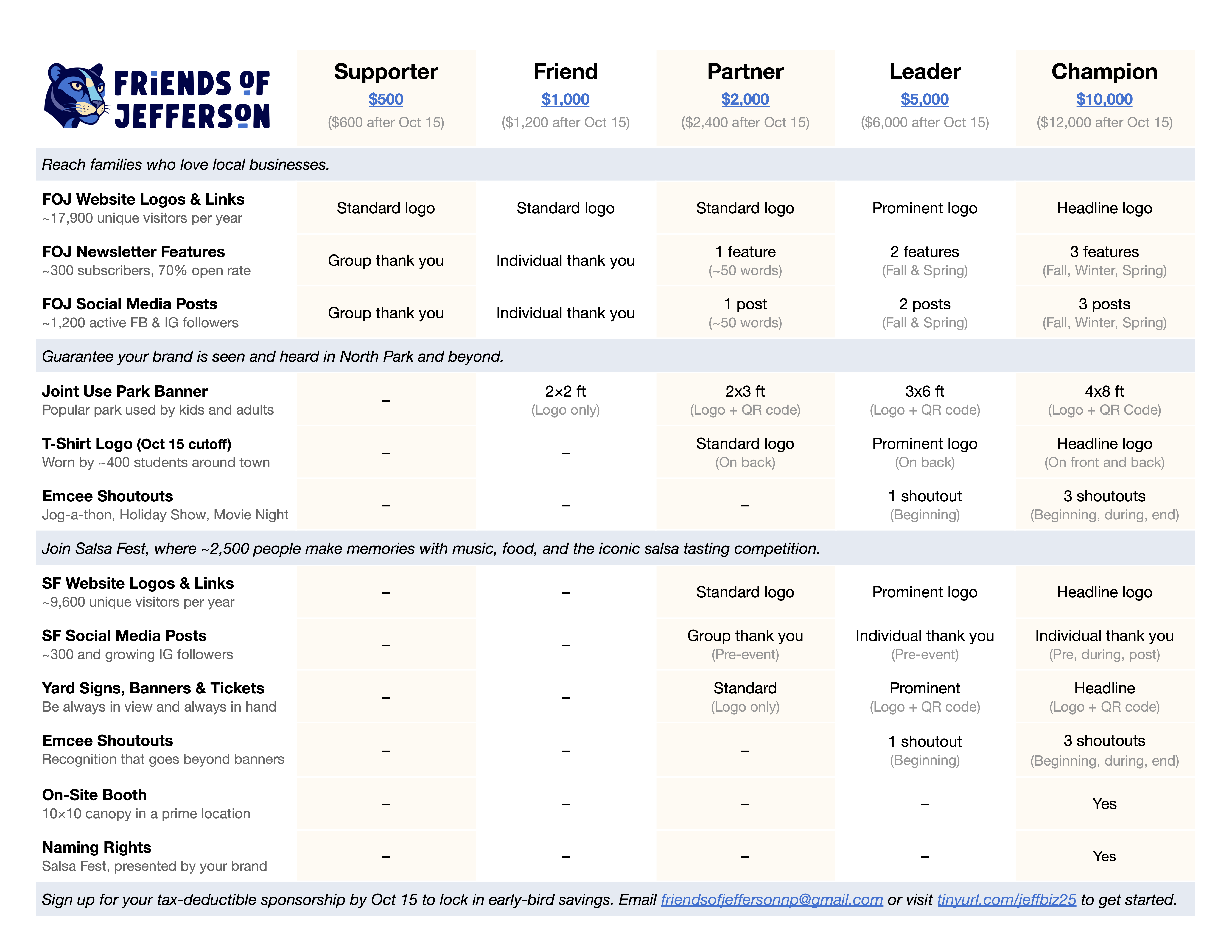 Check out our sponsorship levels below & please consider making a direct impact on the education of North Park kids today. FoJ is a 501 (c) (3) organization and all donations are tax deductible.
